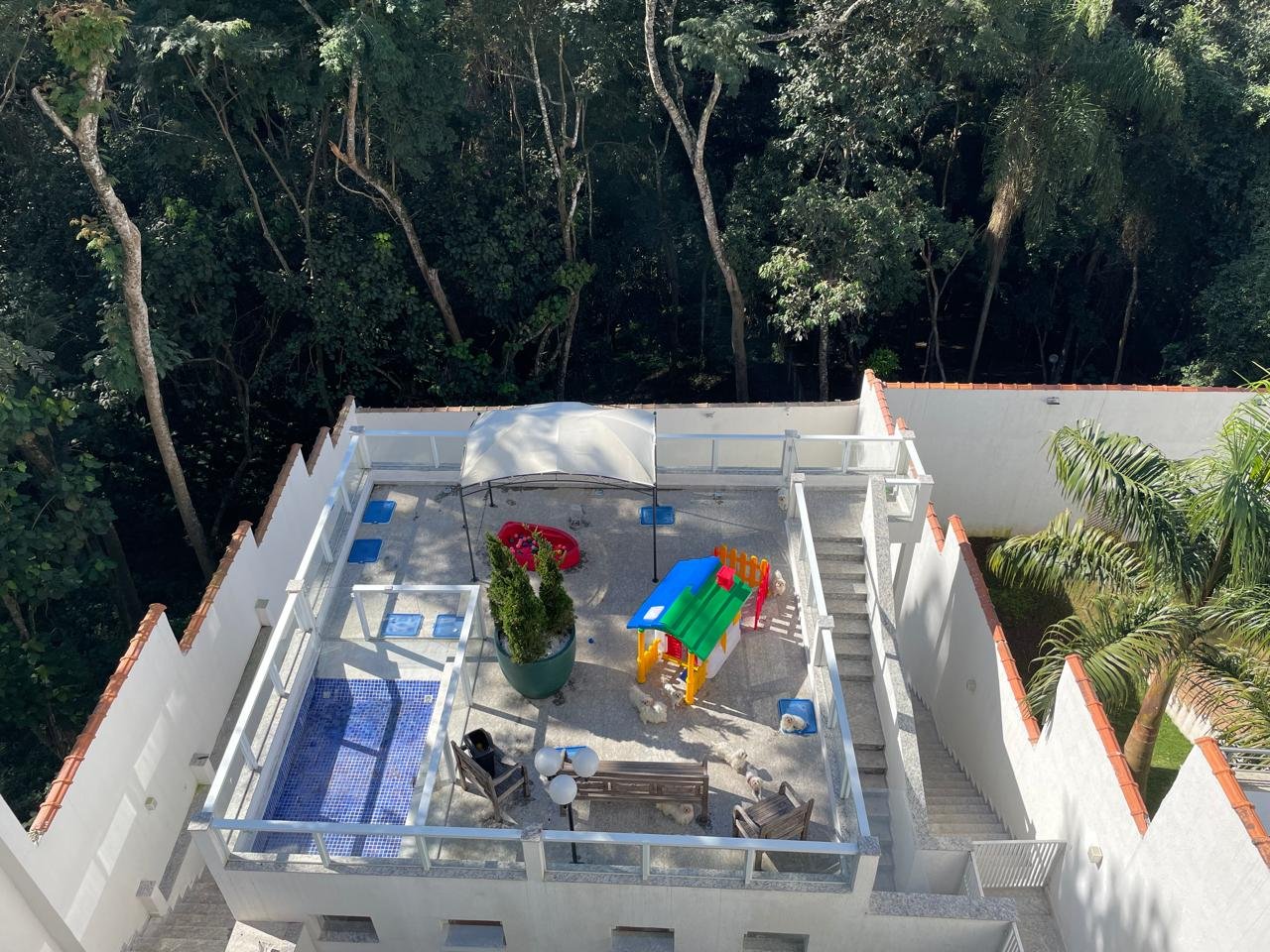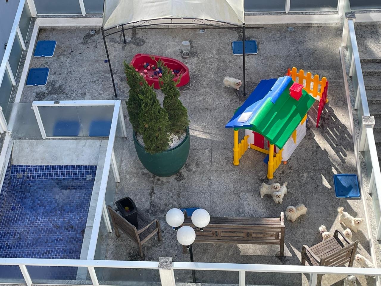 Todos os setores têm quintal próprio com solário e piscina, onde os cães passam o dia, além de um Spa para banho semanal, feito por nossa Groomer.